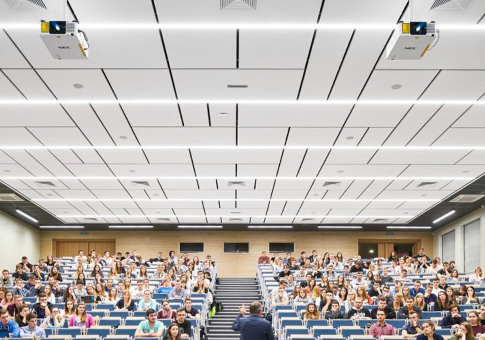 Yüzer tavan sistemi, ses dalgalarını üst hacimde etkin biçimde emerek yankı süresini dengeler.